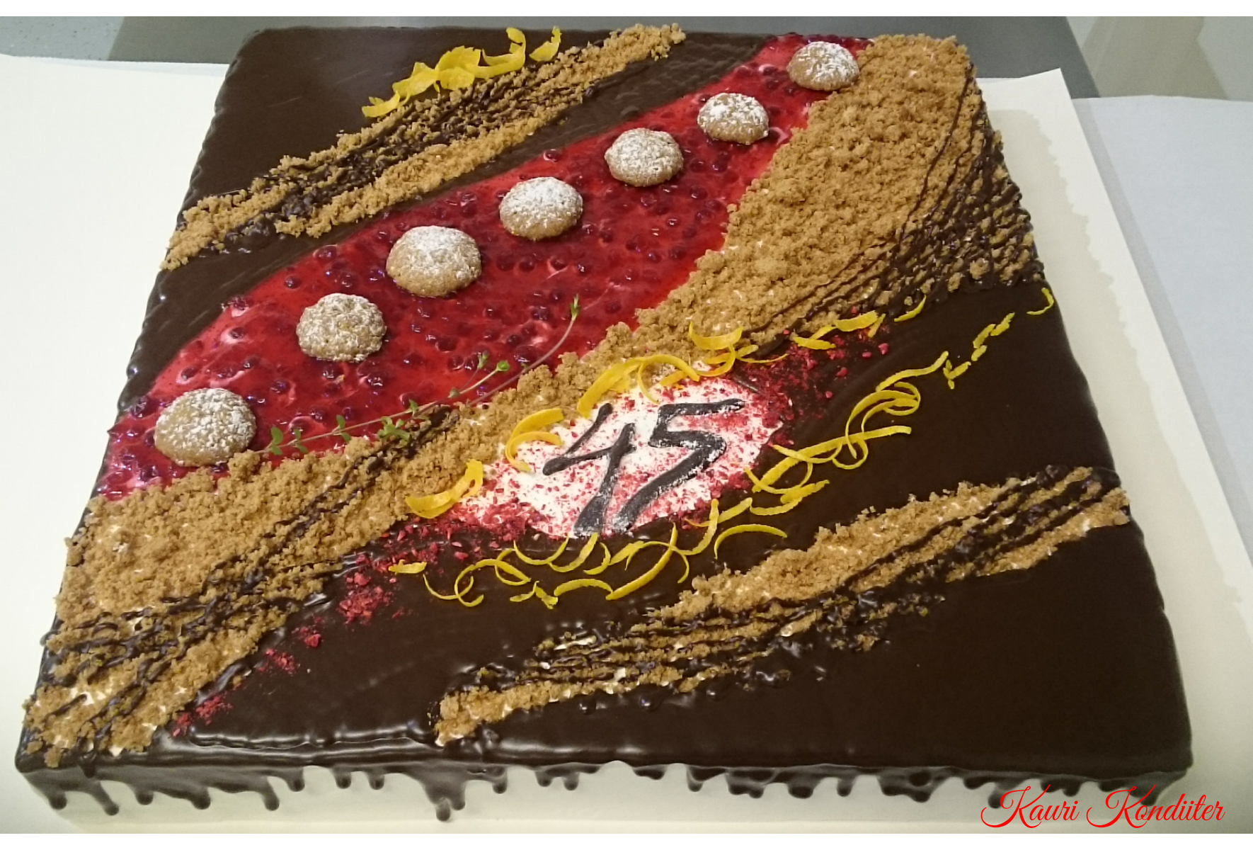 Krõbeküpsisepõhjal tort apelsinikreemi ja pohla-vahukoore-kohupiimakreemiga, peal šokolaadiganache’, pohlamoos, krõbepõhjapuru