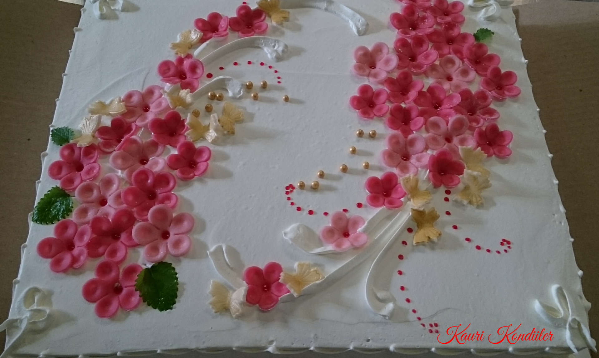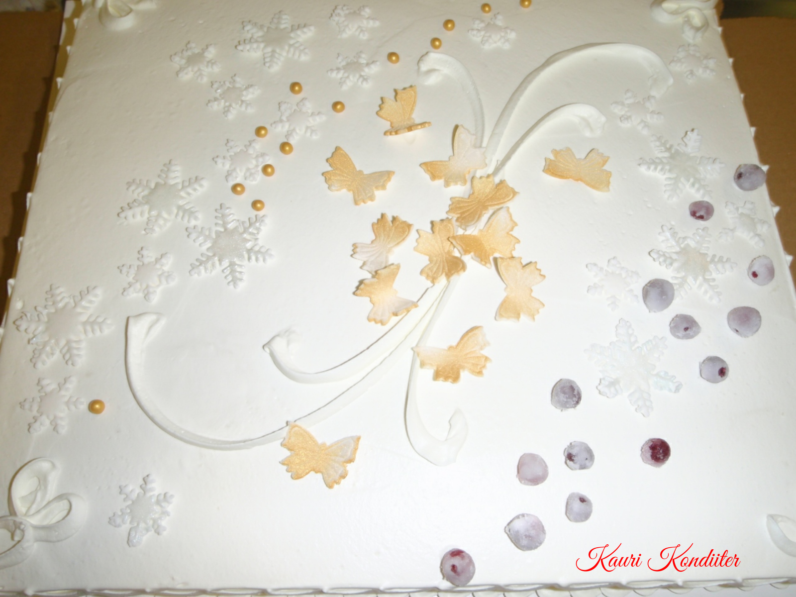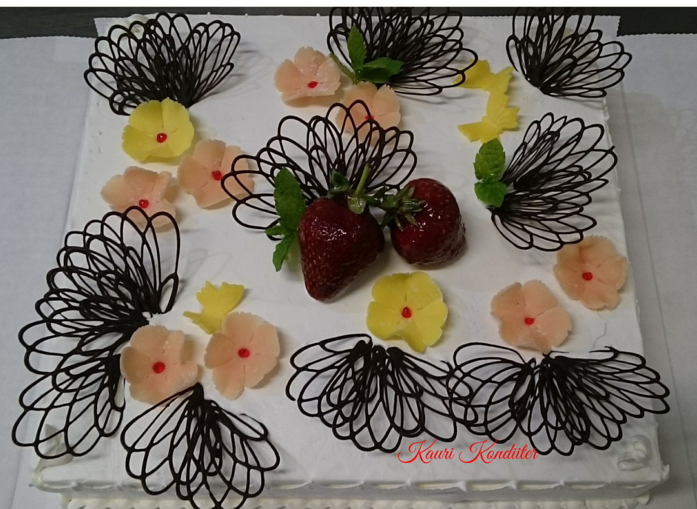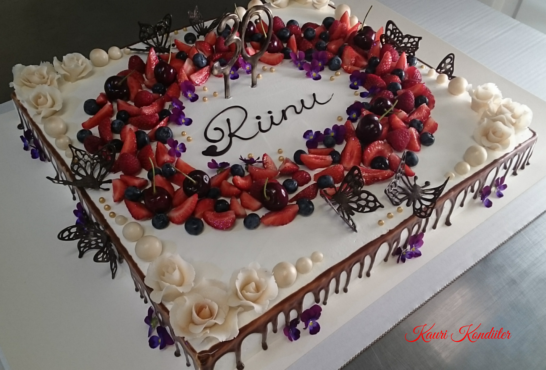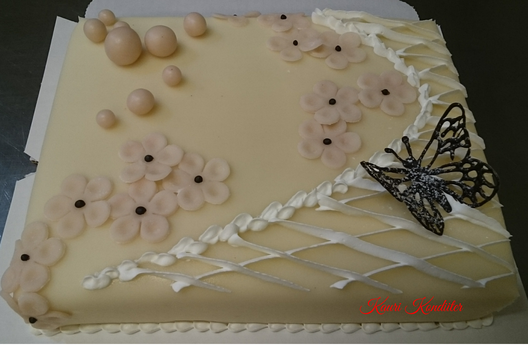 - Kreemikattega tort martsipanililledega, marjakaunistusega, šokolaadist liblikad