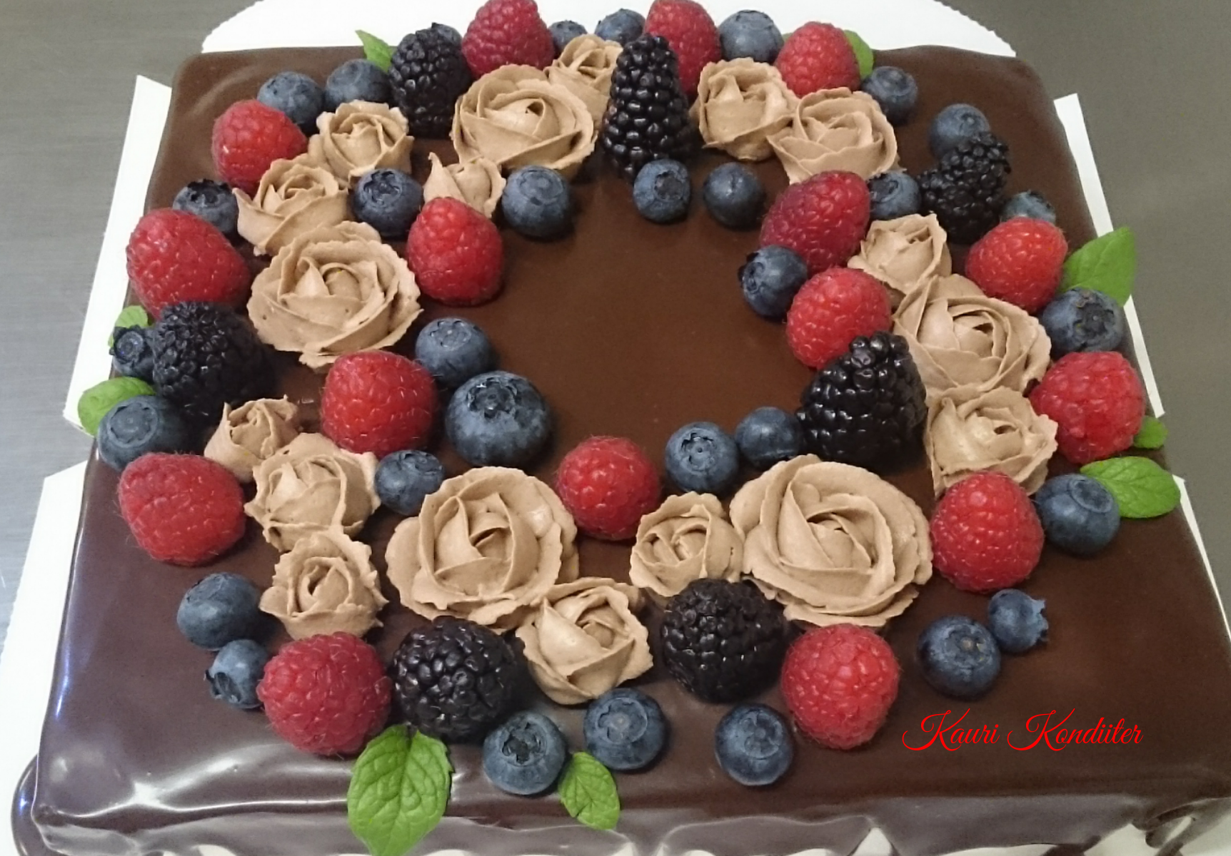 - Kohupiima-marja tort, šokolaadiganache’ga muster, marjad, šokolaadist elemendid