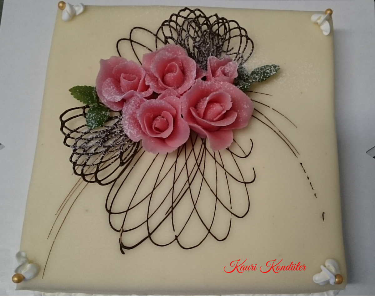 - Martsipanikattega tort, martsipanililledega, prinditud suhkrupildiga, šokolaadist lehed