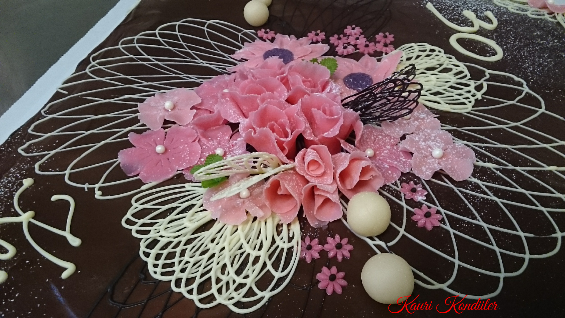 - Kreemikattega tort, šokolaadiganache’ga joonistatud pilt, martsipanililled