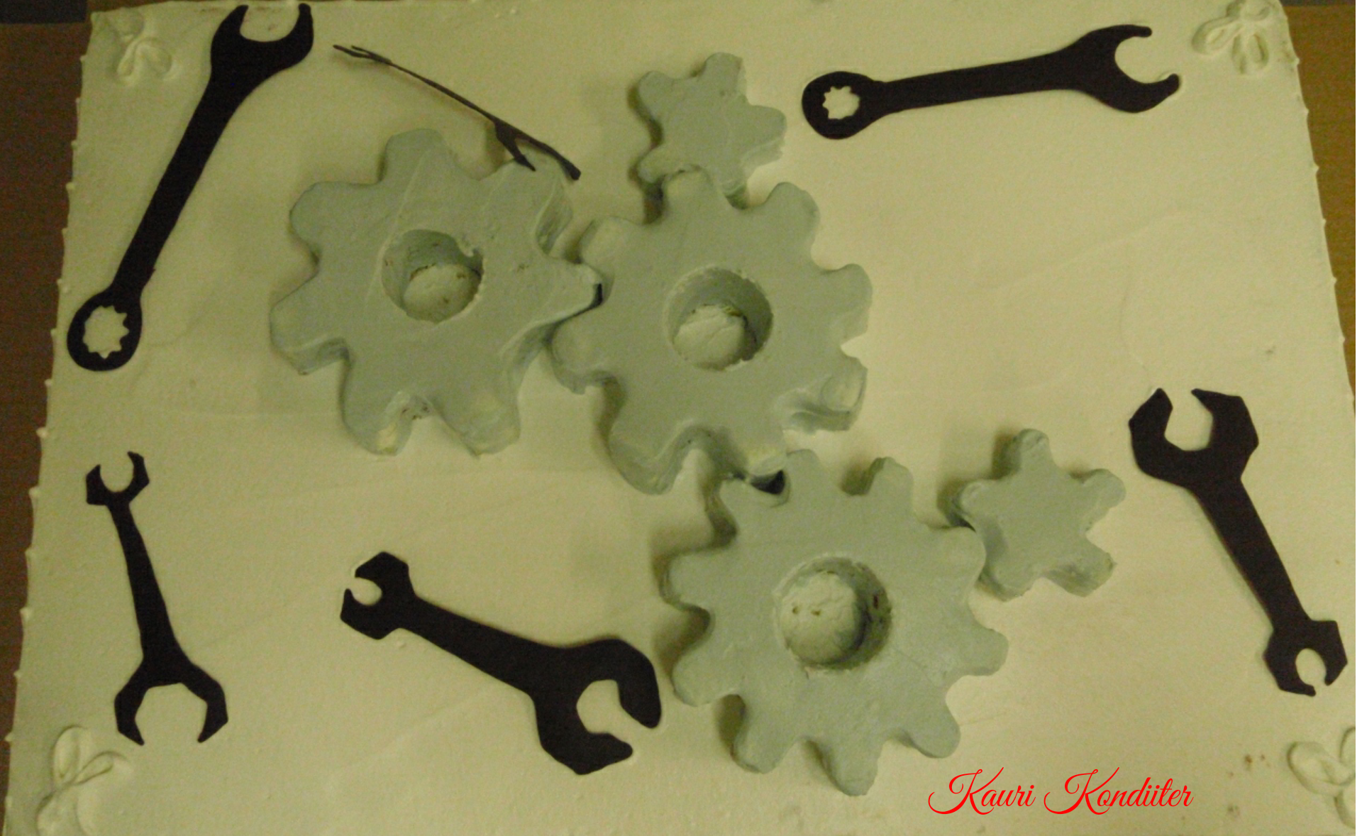 - Kreemikattega tort 3D elementidega (šokolaadist mutrivõtmed ja hammasrattad-minitordikesed)