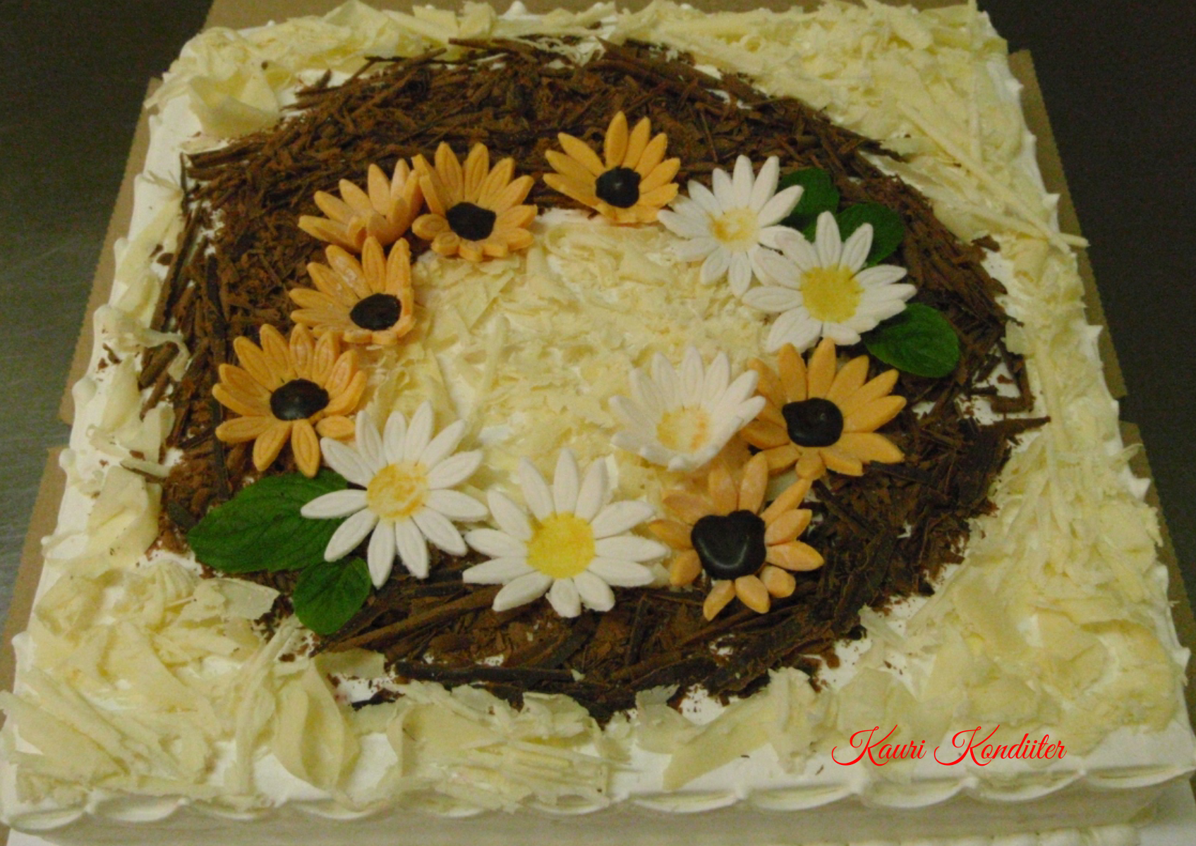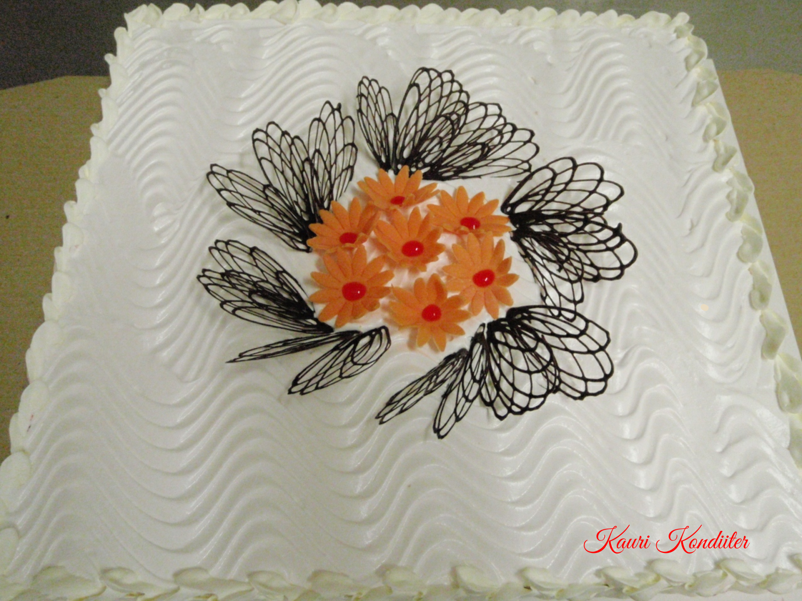- Kreemikattega tort, joonistatud lillekesed, šokolaadist kaunistus