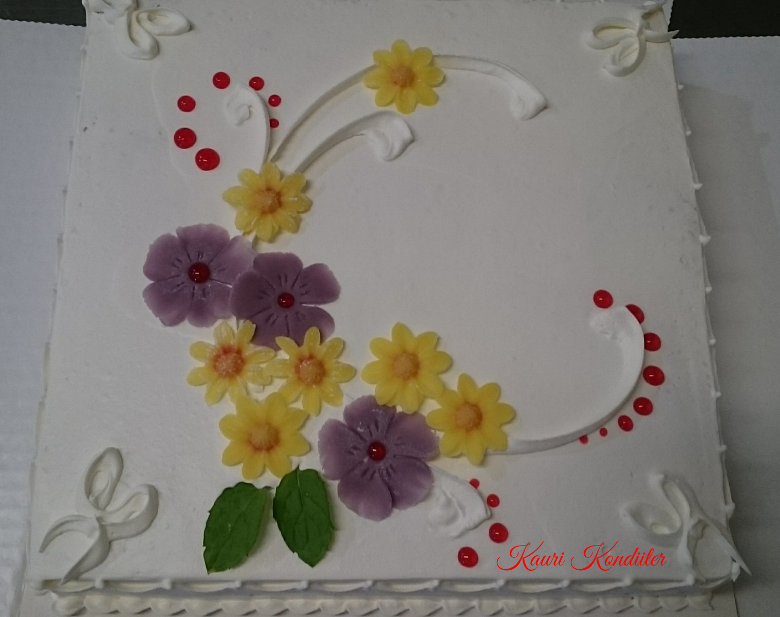 - Kreemikattega tort, joonistatud lilled
